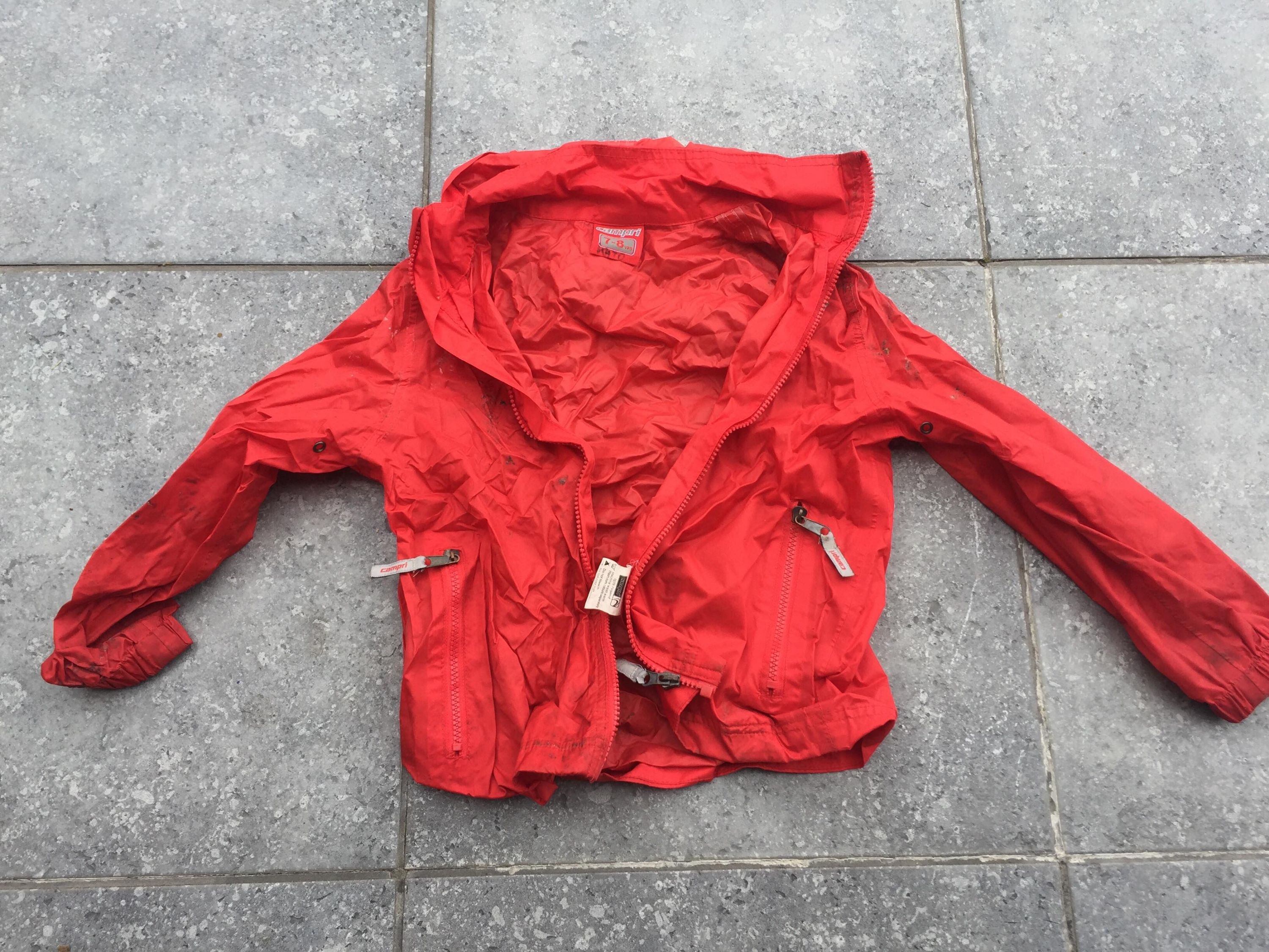 | Rode regenjas met 'KATO' op het etiket. | ![]() |